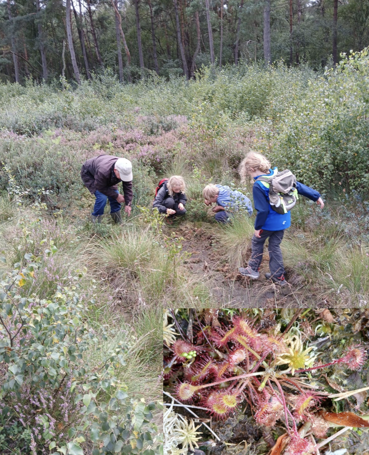 Mit Unterstützung von Horst Hagenberg suchten wir im Oldhorster Moor nach typischen Moorpflanzen und -tieren. Dabei entdeckten wir sogar den unter besonderem Schutz stehenden Sonnentau (kleines Bild). Das ist eine der wenigen Pflanzen in Deutschland, die auch tierische Nahrung wie Insekten "verdauen" kann, wenn der Boden so nährstoffarm ist wie im Moor.